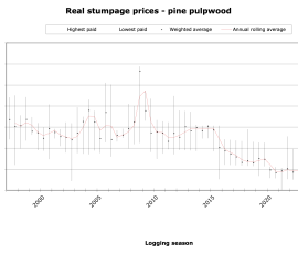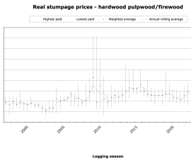 These charts document stumpage that Two Trees Forestry has sold, with prices adjusted for inflation, since May 1997 in Maine, within the area roughly bounded by New Hampshire to the west, US Route 2 to the north, Belfast to the east, and Portland to the south. Several variables contribute to the range that contractors pay during any season including differences in their access to markets, logging costs, volumes harvested and whether we sold them the timber through an auction.