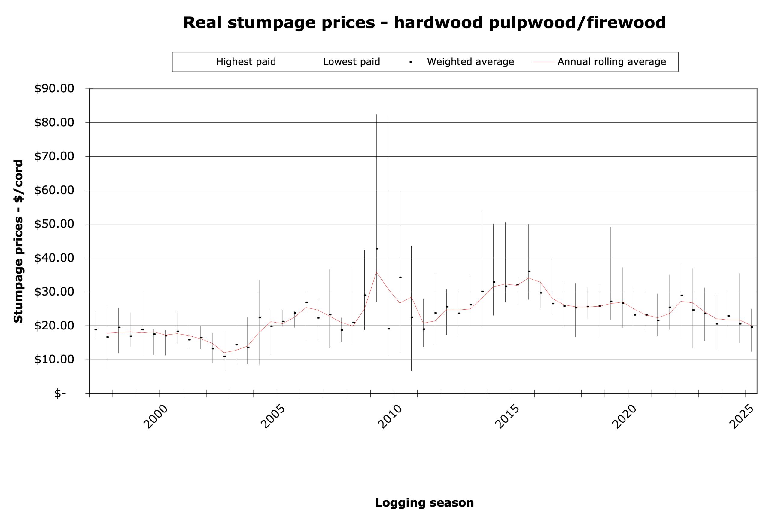 These charts document stumpage that Two Trees Forestry has sold, with prices adjusted for inflation, since May 1997 in Maine, within the area roughly bounded by New Hampshire to the west, US Route 2 to the north, Belfast to the east, and Portland to the south. Several variables contribute to the range that contractors pay during any season including differences in their access to markets, logging costs, volumes harvested and whether we sold them the timber through an auction.